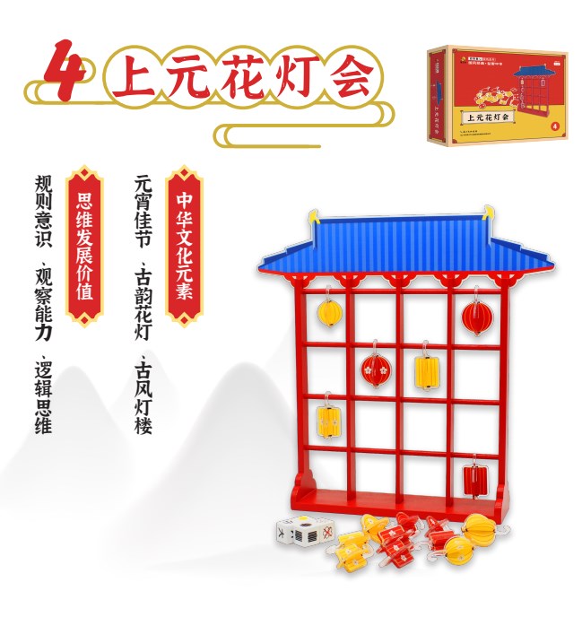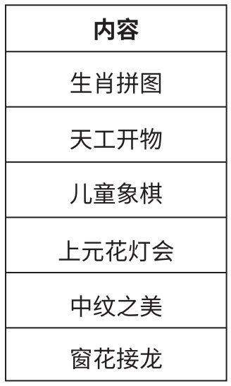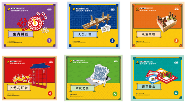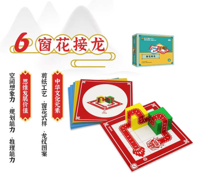 生肖拼图——图形符号设计师; 天工开物——空间造型建筑师; 儿童象棋——逻辑推理精算师; 上元花灯会——信息整合分析师; 中纹之美——挥毫泼墨书画师; 窗花接龙——路径布局规划师;