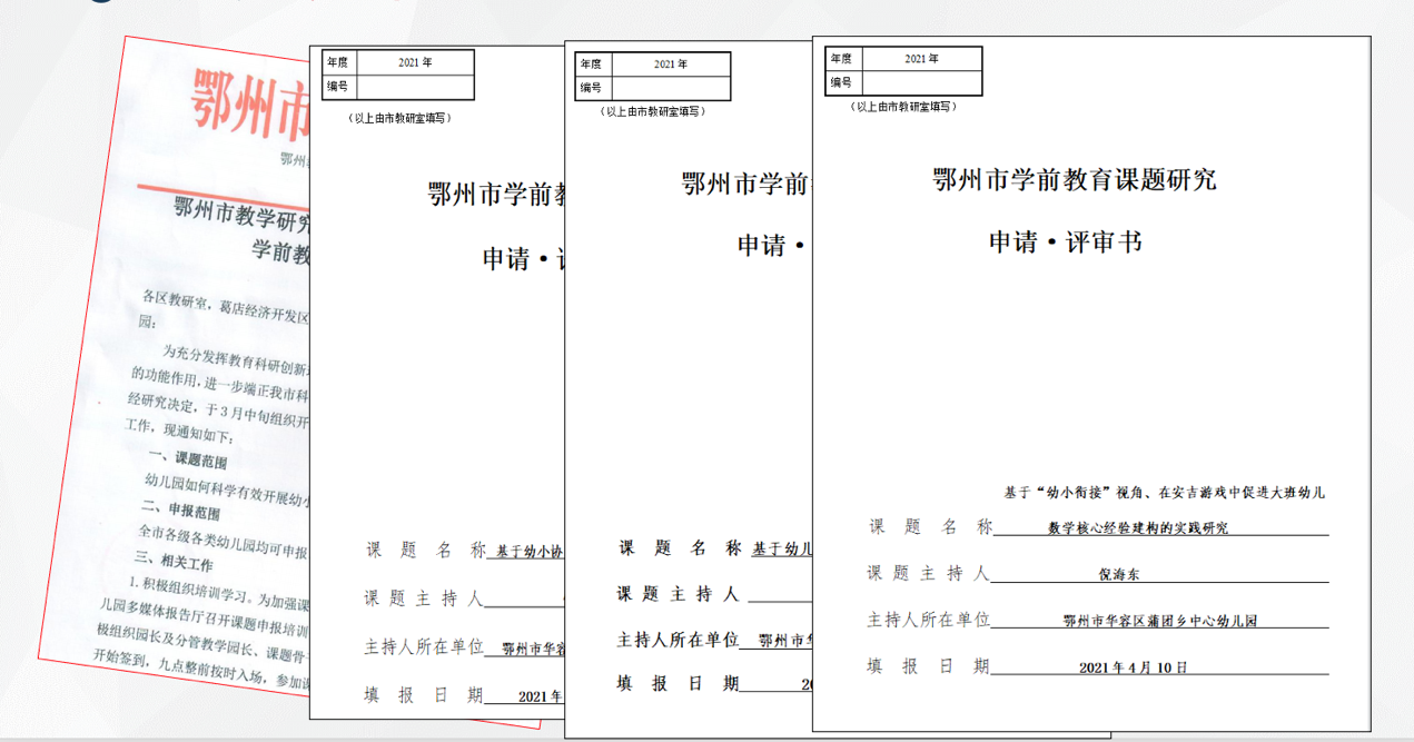 2021年4月,湖北省鄂州市三所公办园:华容一幼(一级园)、红莲湖中心幼儿园(一级园)、蒲团乡中心幼儿园(市级示范园),同时申报市级“幼小衔接”相关课题。