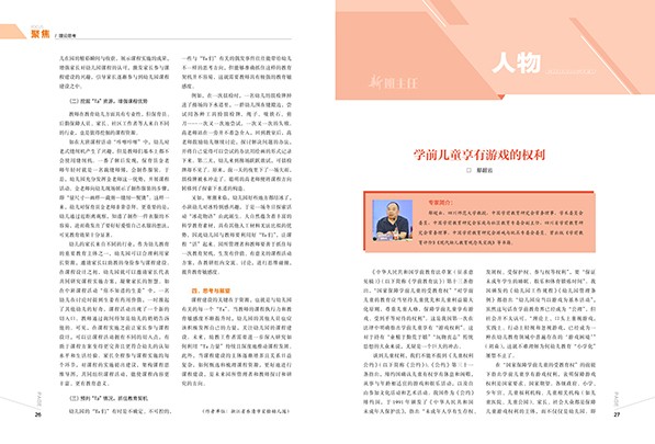 P01 陈 栋 有担当的梦想更值得追逐 ——2022新年感言 P12 尹梦杰 王任梅 儿童教育戏剧中游戏精神的缺失与重建 P27 鄢超云 学前儿童享有游戏的权利 P29 叶倩倩 凌 蓉 学前教育是充满挑战和乐趣的事业 ——访山东省淄博市柳泉幼儿园园长刘霞 P32 王秀霞 “六步法”让幼儿在自主游戏中深度学习