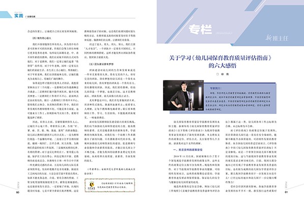 P01 陈 栋 让思想之光照亮幼教前行之路 P18 陶 慧 深度学习视阈下教师有效提问的策略 P41 凌 蓉 叶倩倩 只有发现自己的优势,才能走得更远更好 ——访安徽省阜阳市文峰幼儿园园长刘亢亢 P44 杨 珍 我的主题墙我做主 ——中班主题墙创设实践 P61 柳 倩 关于学习《幼儿园保育教育质量评估指南》的六大感悟