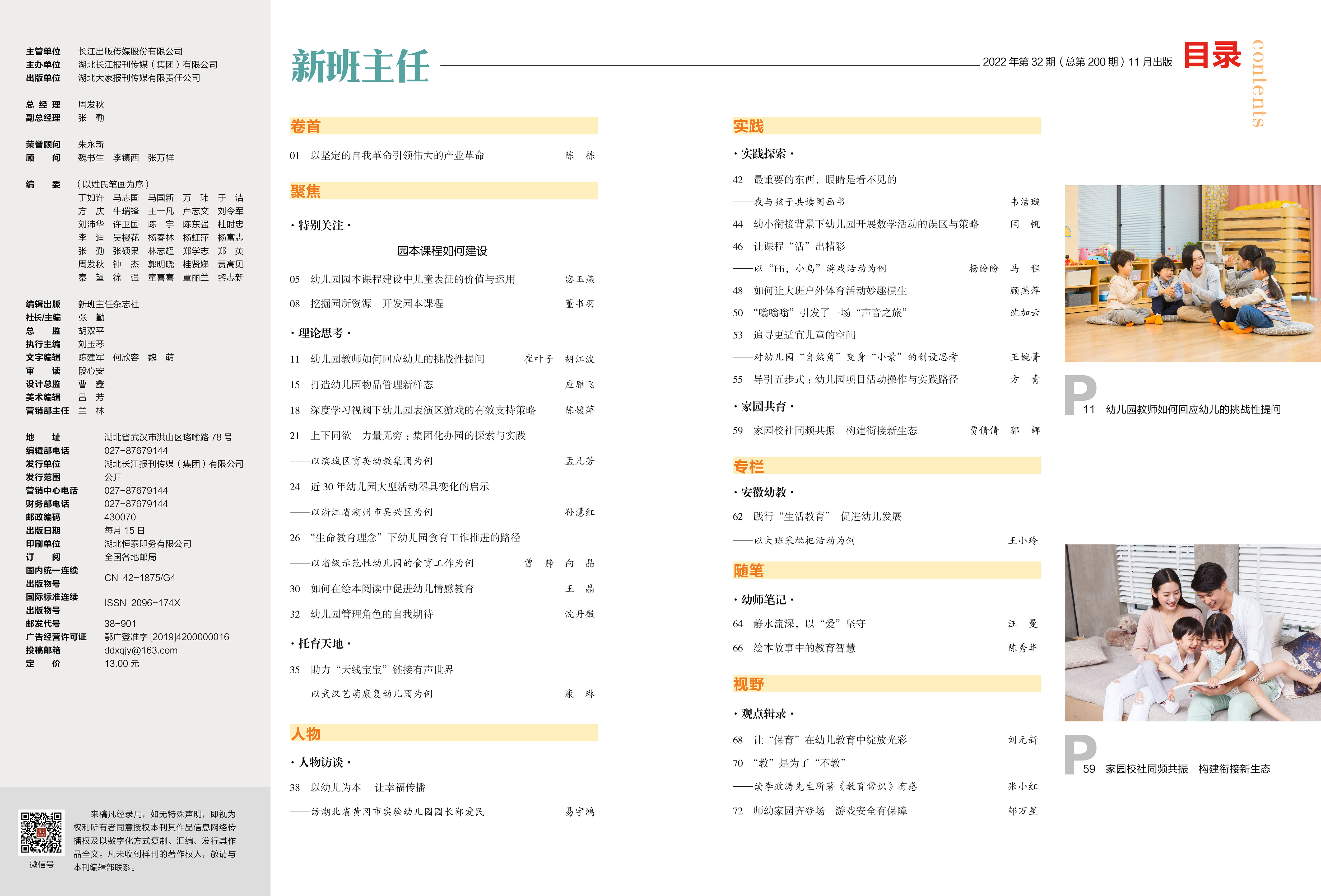 P01 陈 栋 以坚定的自我革命引领伟大的产业革命 P05 宓玉燕 幼儿园园本课程建设中儿童表征的价值与应用 P11 崔叶子 胡江波 幼儿园教师如何回应幼儿的挑战性提问 P38 易宇鸿 以幼儿为本 让幸福传播 ——访湖北省黄冈市实验幼儿园园长郑爱民 P64 汪曼 静水流深,以“爱”坚守