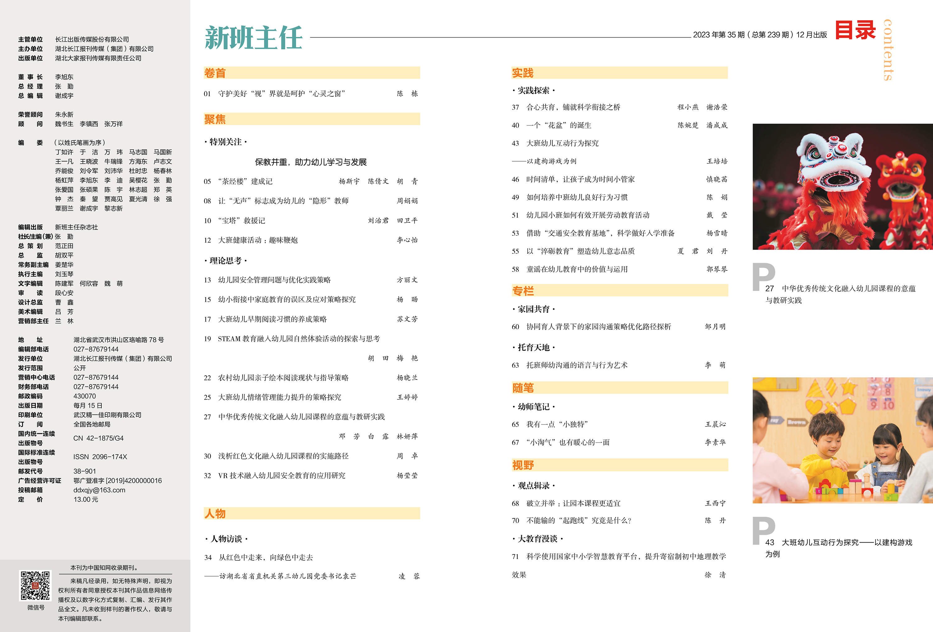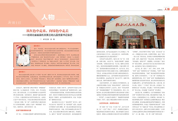P01 陈 栋 守护美好“视”界就是呵护“心灵之窗” P05 杨斯宇 陈倩文 胡青 “茶经楼”建成记 P13 方丽文 幼儿园安全管理问题与优化实践策略 P34 凌 蓉 从红色中走来,向绿色中走去 ——访湖北省省直机关第三幼儿园党委书记袁芒 P65 王晨沁 我有一点“小独特”